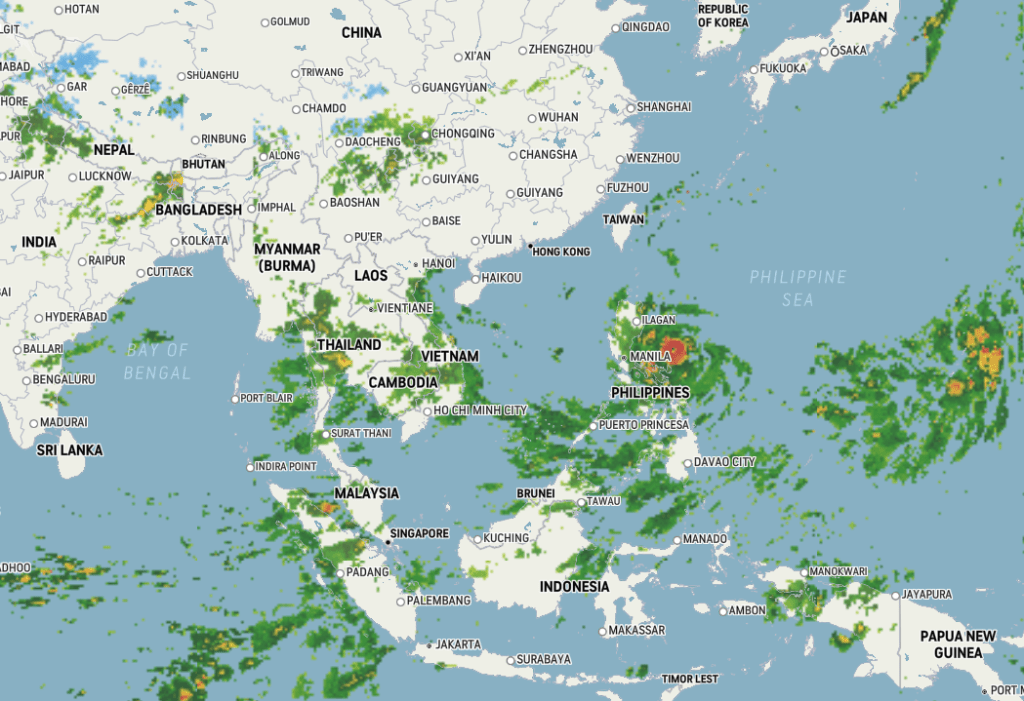 Many people are pointing out the lack of flights over China using websites like FlightRadar24. This same website allows users to change the time to look at historical flights. If you turn back the time to one week ago, you will see that flights remain relatively the same. Some flights have been cancelled but this is due to a major storm approaching from the southeast over the Philippines. The image below shows the approaching storm.